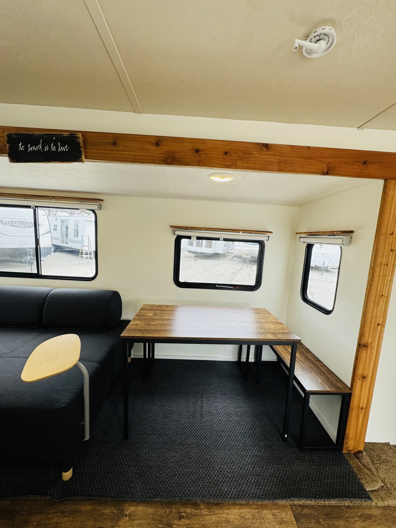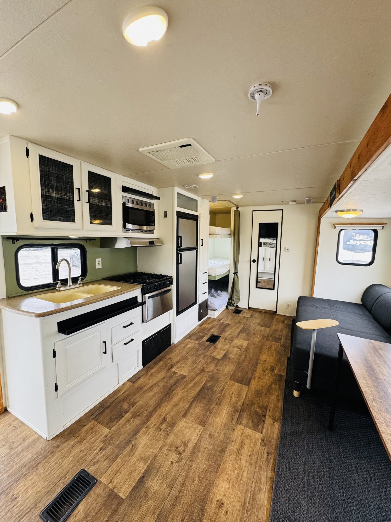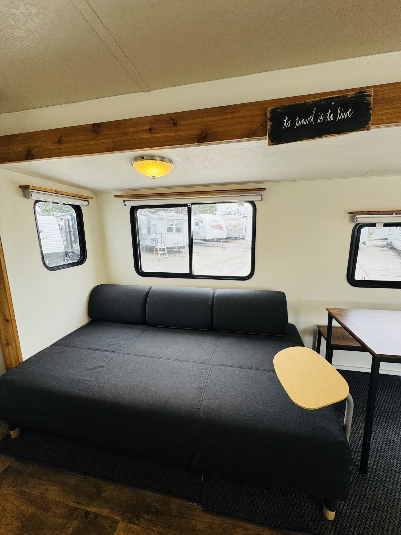 Layout: Front queen bed + double-over-double bunks + dinette + sofa-cum-bed