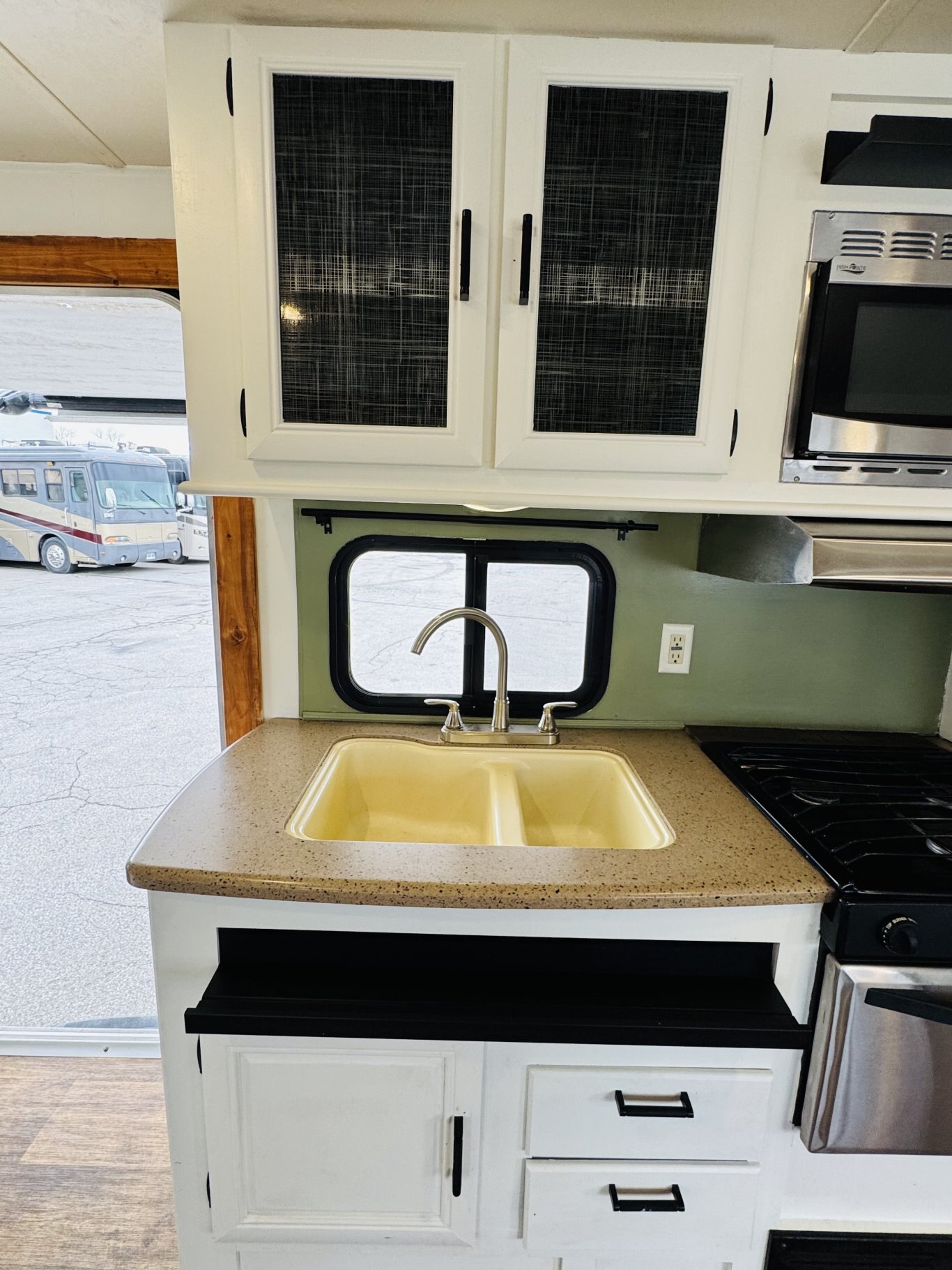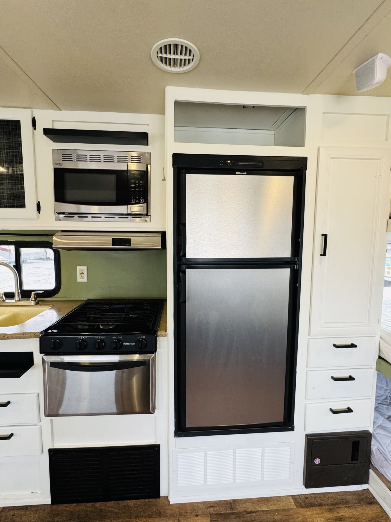 Kitchen: 3-burner stove, oven, microwave, double-door fridge & double sink