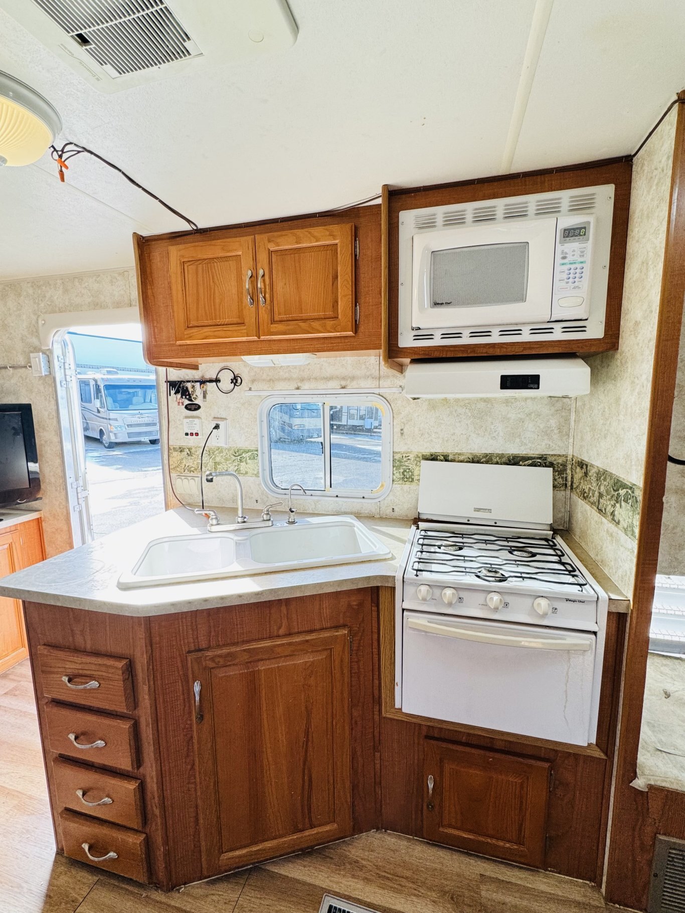 ✅ Kitchen: 3-burner stove, oven, microwave, fridge, double sink